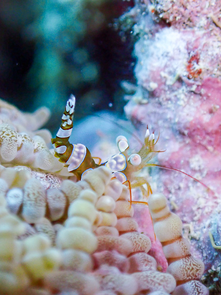 いつもはイソギンチャク横のガレ場に追いやられているイソギンチャクモエビですが今日はイソギンチャクに乗れていました✨